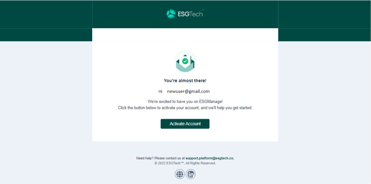 When a new user is onboarded to ESGManage, they will receive an email like the one below. Click on the ‘Activate Account’ link to be directed to the ESGManage web portal.